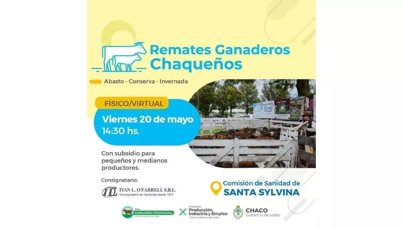 A partir de las 14.30, se realizará en Santa Sylvina el sexto remate ganadero del año organizado por el Ministerio de Producción, Industria y Empleo. Saldrán a pista unos 1.200 animales aportados por unos 45 pequeños y medianos productores de la zona.