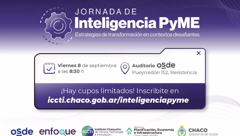 El Instituto Chaqueño de Ciencia, Tecnología e Innovación (ICCTI) organiza la primera Jornada de Inteligencia para Pymes. Durante el evento se brindará información sobre financiamiento y empleo, iniciativas innovadoras locales, estrategias de transformación digital y espacio de networking. La actividad se realizará el viernes 8 de septiembre a las 8:30 en el auditorio de OSDE (Pueyrredón 152) de Resistencia.