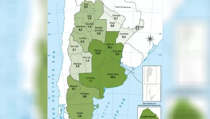 Evidentemente, la región pampeana (y con más precisión tres provincias: Buenos Aires, Santa Fe y Córdoba) generan 70 de cada 100 dólares que ingresan al país por productos, según el último informe del Indec resumiendo la primera mitad del año. Después, Patagonia suma casi 9%, Noroeste un 6% y Cuyo otro 6%.