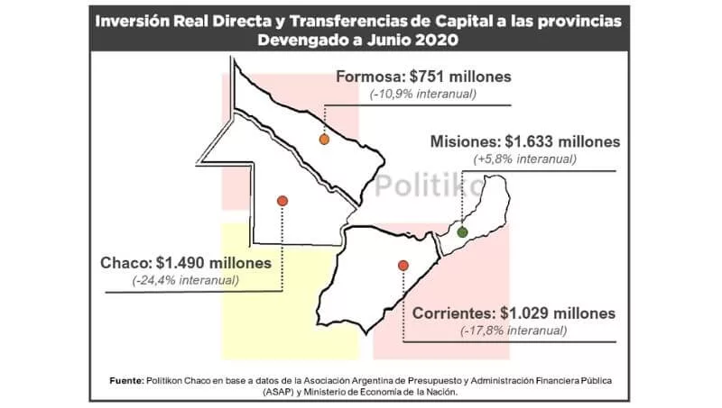 En la región, Misiones tuvo la ejecución nominal más alta: $ 1.633 millones, experimentado un crecimiento interanual del 5,8%, única provincia con incrementos. A su vez, Chaco tiene la segunda mayor ejecución con $ 1.490 millones, pero sufrió una caída del 24,4% interanual. Formosa, por su parte, tuvo una caída del 10,9% y totaliza $ 751 millones; Corrientes, por su parte, mostró una ejecución de $1.029 millones y una caída interanual del 17,8%.