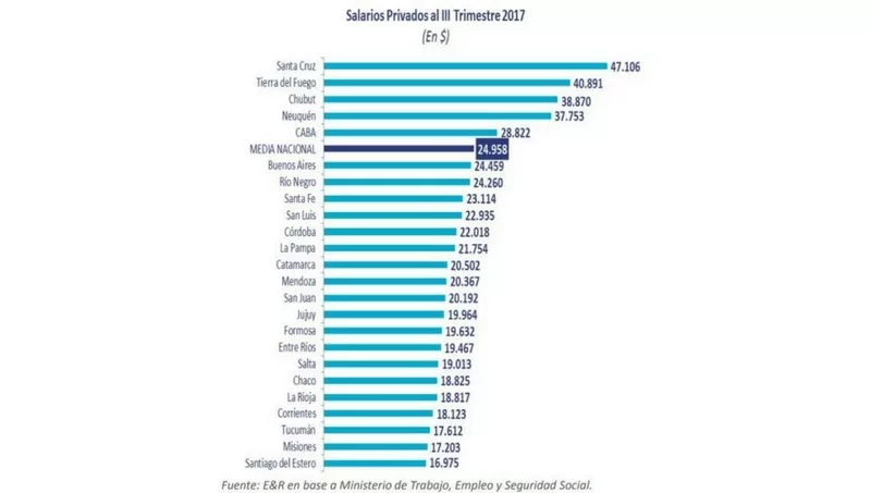 Solo cinco distritos, Santa Cruz, Tierra del Fuego, Chubut, Neuquén y la Ciudad de Buenos Aires, superan el salario promedio en bruto del sector privado de Argentina que fue de $24.958 pesos mensuales, en el tercer trimestre de 2017. En el resto de las provincias, los sueldos están por debajo de la media nacional.