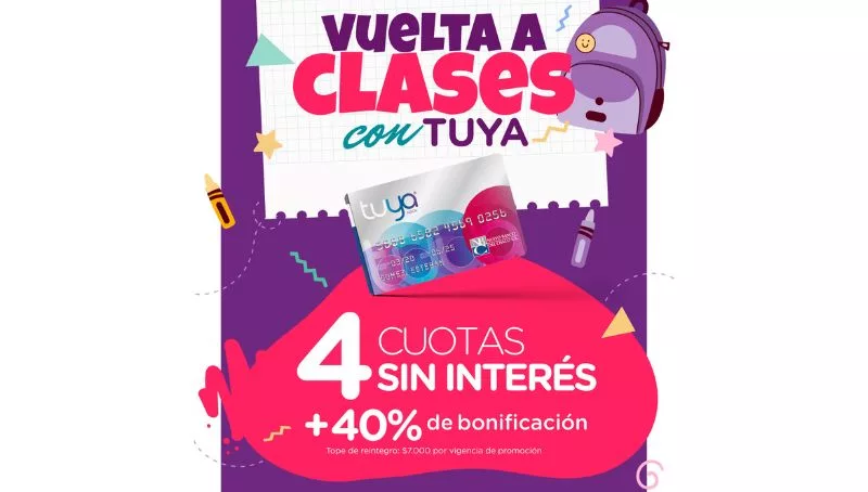 Esta promoción especial de Tuya tiene el beneficio de 4 cuotas sin interés con 40% de bonificación aportada por Nuevo Banco del Chaco y el Gobierno Provincial, con tope de reintegro de $ 7.000 por vigencia de promoción. Está habilitada en comercios adheridos de los rubros librería y papelería, indumentaria escolar, zapatería, marroquinería y óptica.