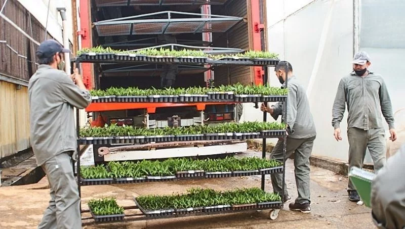Una vez que llegan a su tamaño de rustificación son enviados a la zona donde serán implantados en el norte de Salta. Es la tarea que se inició con el despacho de 60 mil plantines. La presentación en bandejas simplifica y hace más económico el transporte hasta la zona productora. Allí son trasplantados a macetas de mayor tamaño donde estarán durante 8 semanas hasta alcanzar el porte y dimensiones definitivos, para su pase al suelo donde completará su desarrollo y llegará a la fructificación. En esa zona, la época para trasladar las plantas a campo es entre agosto y noviembre.