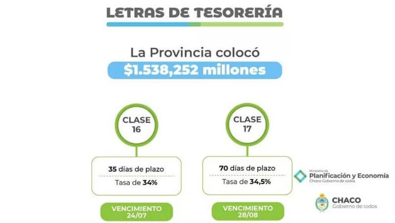 En esta oportunidad se adjudicaron dos clases de letras a distintos plazos: a 35 y 70 días, con vencimiento el próximo 24 de julio y 28 de agosto y con tasas del 34% y del 34,50 %, respectivamente. A partir de estos resultados y transcurrido el primer semestre del 2020, la provincia del Chaco ostenta un track record más que oportuno, dada la coyuntura actual, sustentado en la confianza de los inversores respecto del manejo de sus finanzas públicas y la conveniente consolidación en el mercado de capitales a partir de su agente financiero, el Nuevo Banco del Chaco S.A. (Nuevo Chaco Bursátil S.A. sociedad perteneciente al banco es la entidad encargada de estructurar el proceso de licitación).