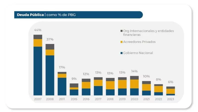 En un marco de cuentas fiscales superavitarias, esa reestructuración garantizó el desendeudamiento definitivo de la provincia: en 2023, la deuda pública será equivalente al 6% del Producto Bruto Geográfico (PBG) chaqueño, lo que representa una disminución del 60% respecto al pico alcanzado durante la pandemia.