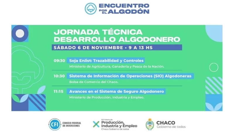 El sábado, en tanto, también de 9 a 13, se llevará adelante una jornada técnica denominada Desarrollo Algodonero, a cargo de la Subsecretaría de Agricultura con acompañamiento del Ministerio de Agricultura de la Nación y la Bolsa de Comercio del Chaco.