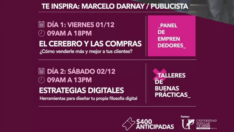 Podes adquirir tus entradas anticipadas hasta el 25 de noviembre por un valor de $400 por ambos días. O hasta el dia del evento a $500.
