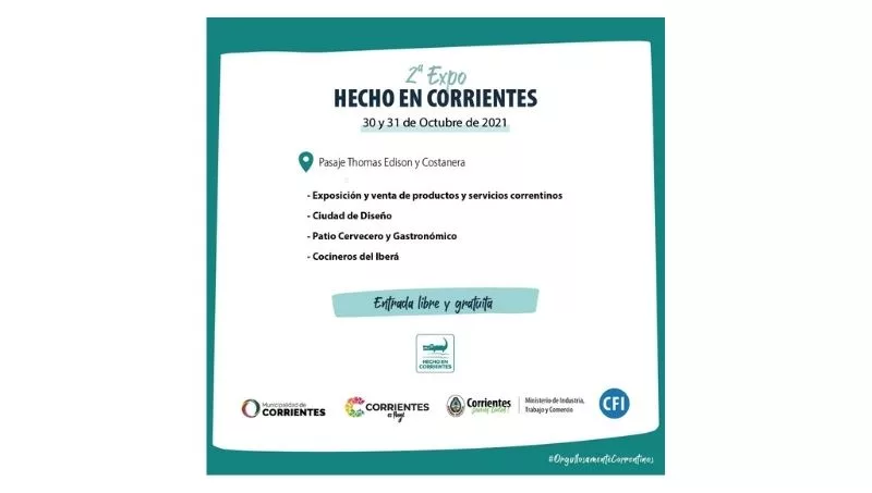 La Provincia de Corrientes, a través del Ministerio de Industria, Trabajo y Comercio, invita a la segunda edición de la Expo Hecho en Corrientes que se realizará el sábado 30 y domingo 31 de octubre en el Pasaje Thomas Edison y Avenida Costanera de la capital.