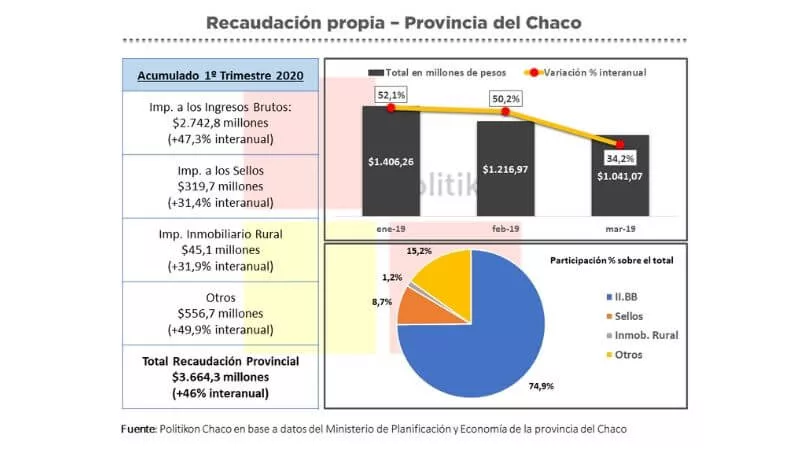 De acuerdo a las planillas elaboradas por el Ministerio de Planificación y Economía de la Provincia del Chaco, la recaudación tributaria chaqueña durante el primer trimestre del año 2020 totalizó $ 3.664,3 millones, y de ese total, el 74,9% corresponde solamente a los Impuestos a los Ingresos Brutos.