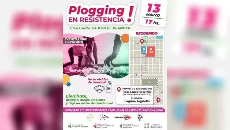 La Ciudad de Resistencia y distintas organizaciones ambientalistas invitan a todos los vecinos a ser parte de la primera jornada de “Plogging” que se realizará este sábado 13 de marzo, a las 17, desde la plazoleta ubicada sobre la avenida López Piacentini al 1300.