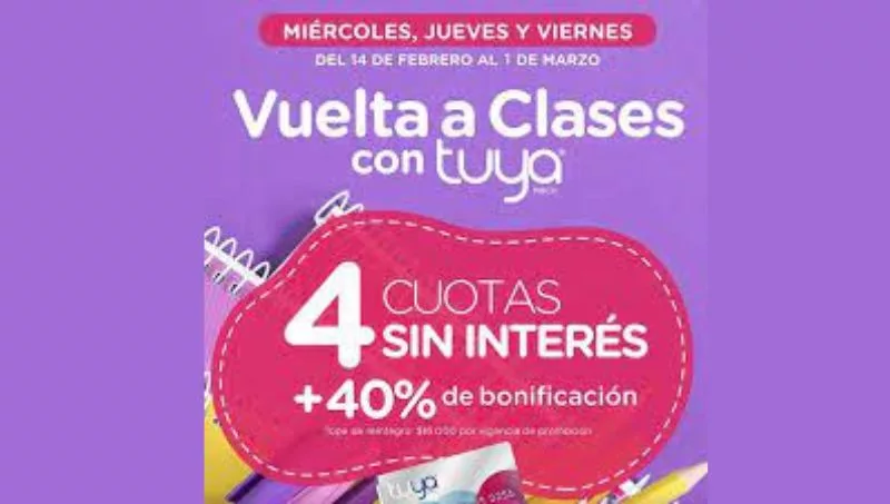 La bonificación de Vuelta a Clases con Tuya tiene tope de $ 16.000 pesos durante la vigencia de la promoción y se puede utilizar con Tuya Tradicional, Tuya Joven, Tuya Activa y Tuya Pyme, con las 4 cuotas sin interés.