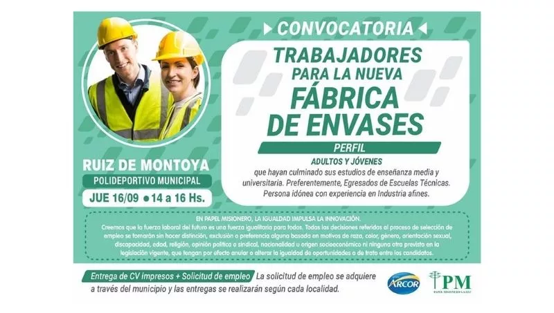 De esta manera, la empresa irá desde el jueves y hasta el sábado a las localidades de la zona de influencia de la planta papelera: Jardín América, Ruiz de Montoya, Puerto Leoni, Capioví y Puerto Rico para recibir currículum.